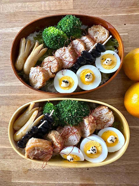* menu du jour *押し麦入りごはんくるくる豚バラ叉焼たこさんウインナーゆでたまごブロッコリーのおひたし黒豆くるくる巻くところまでは前夜に済···