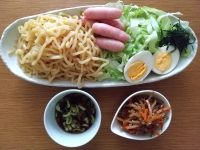 ・ざるラーメン (トッピング:レタス、味玉、ソーセージ、薬味の大葉) ・葱入りつけ汁目玉焼き ・イカ入り金平ごぼう 今日は午後から···