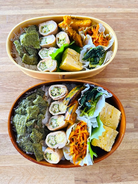 お弁当作りが始まる。~ menu ~*お雑魚と海苔のごはん*オクラとベビーコーンの肉巻き照り焼き*カボチャのグリル*人参のイタリアンきんぴら*小松···