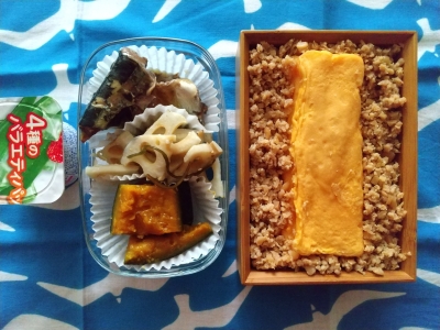 ・変わりそぼろご飯 (大豆入り鶏そぼろ、甘いだしまきたまご) ・秋刀魚の梅煮 ・南瓜の煮物 ・蓮根の塩昆布和え ・ビヒダスヨーグルト &nbs···