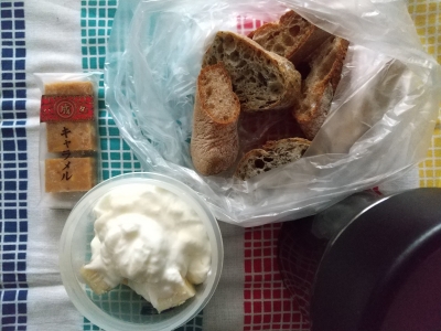 ・和風ポトフ (具:ジャガイモ、人参、玉ねぎ、シャウエッセンパワ辛、セロリ、椎茸、コンソメ、トマトジュース、月桂樹) ・バゲット2種 (ド···