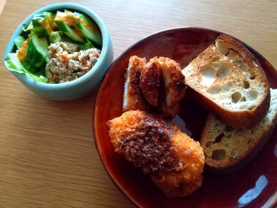 ・フォカッチャ ・お惣菜 蟹クリームコロッケ ・LAWSON 盛りすぎチャレンジカツカレーにのっていたロースカツ ・サラダ (レタス、きゅうり、卯···