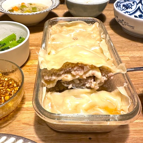 包まない小籠包…風。豚ひき、みじん玉ねぎと調味料を全部混ぜ混ぜ、肉ダネ、濡らしたワンタンを交互に重ねてレンチンするだけ。ラザニアっぽいけどち···