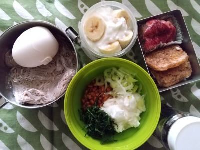 ・そば ・トッピング (納豆、長芋、ねぎ、大葉、温泉たまご) ・つゆ ・牛たたき ・穴子煮 ・バナナ&ヨーグルト 今朝はタイム···