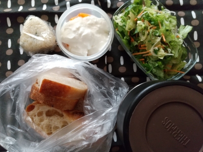 ・いろいろパン (ポーズパン、トリュフベーカリー) ・フードコンテナにポトフ風スープ (具:ニンジン、玉ねぎ、マッシュルーム、ジョンソンヴ···