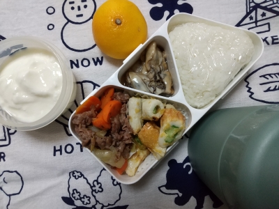・間に韓国のりを入れたおにぎり ・ちくわきゅうりのこまいっこマヨ和え ・牛肉と人参のクミン炒め ・酢牡蠣 ・蕪と油揚げと小松菜とねぎの味噌···